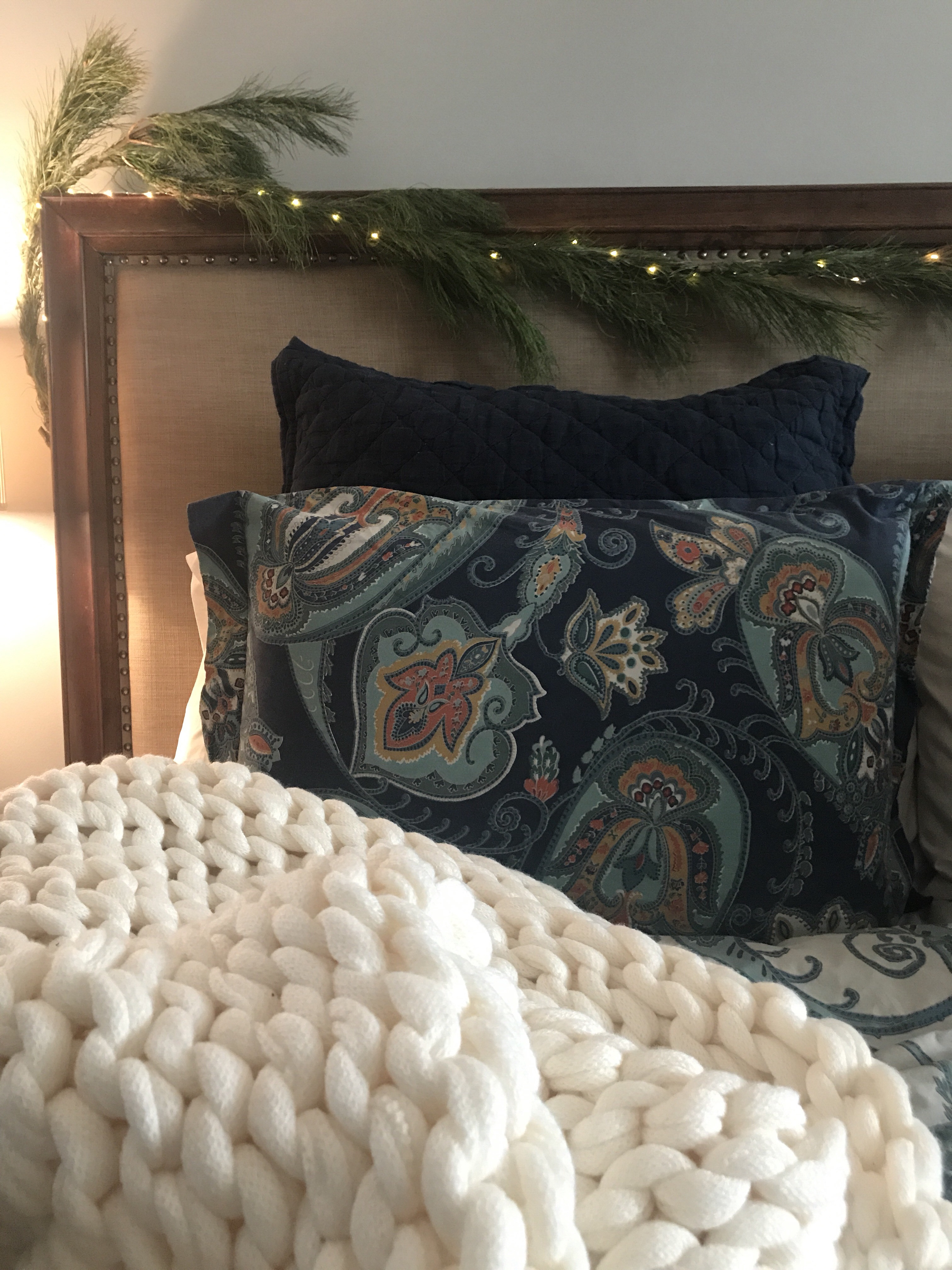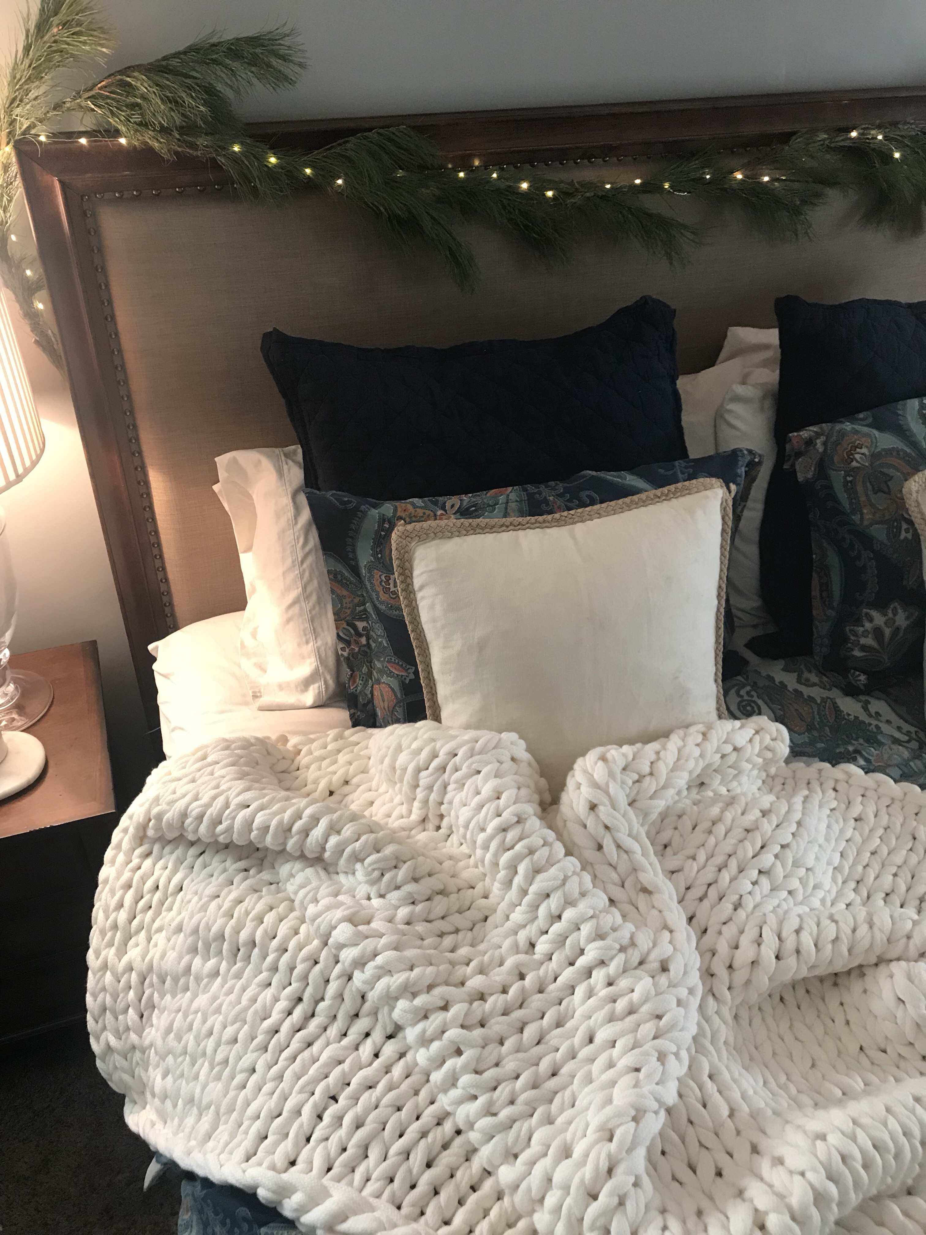 I know, I know…you are thinking how can I possibly decorate our bedroom for Christmas but I promise you once you put a tree with those soft lights in it is hard to not welcome the cozy! The garland above the bed is real from a local flower shop that I LOVE and I would recommend adding some to your space for the scent! Our room is usually the gathering place anyways and at Christmas time it is even more regular. You will find kids watching Netflix, the adults napping or sitting in the massage chair, and always a cat resting under the bed.