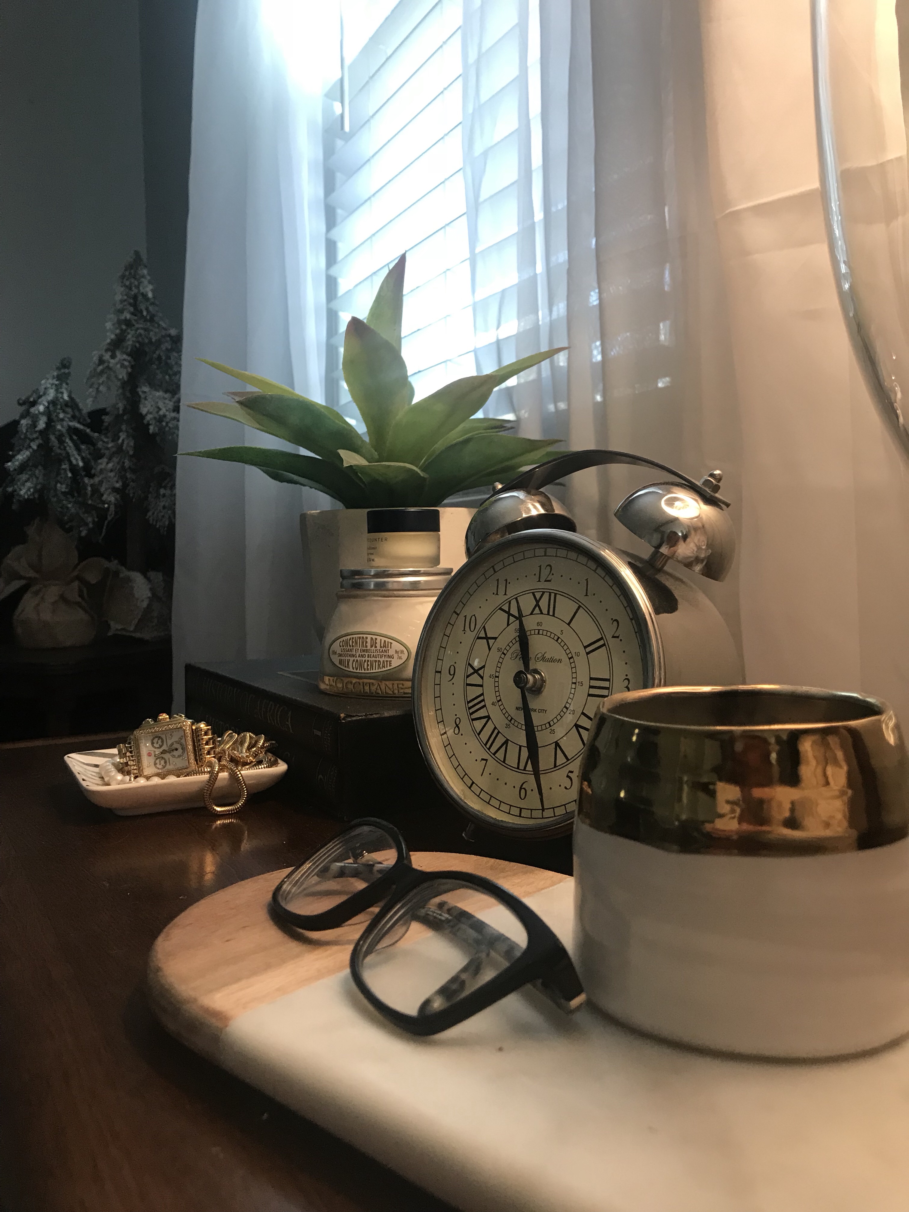 This master bedroom is 26 x 12. It used to be two smaller bedrooms that the previous owners made into one, added a bigger closet, and put this beautiful exposed barn wood beam in the center of the room. We rearranged the room last year to accommodate a king size bed and two nightstands on either side (Bedroom set HERE). Tyler and I both really wanted a nightstand to not only have decent size lamps (THESE, worth the investment!) and clocks, but also hold a bowl of popcorn and a cup of coffee without being crowded.
