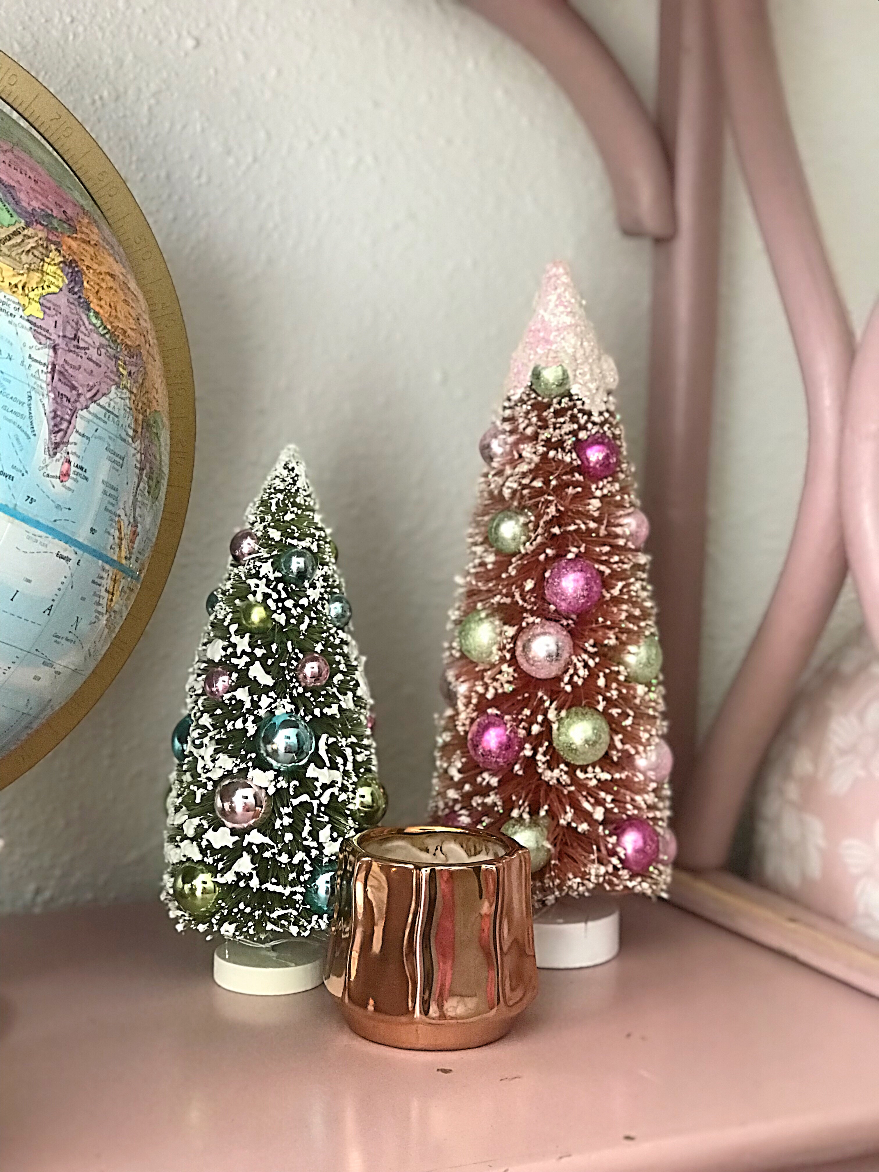 Caroline loves that I put little Christmas decorations up in her room. We added live garland, THESE twinkle lights and some vintage bottle brush trees she found antiquing with her Nana.