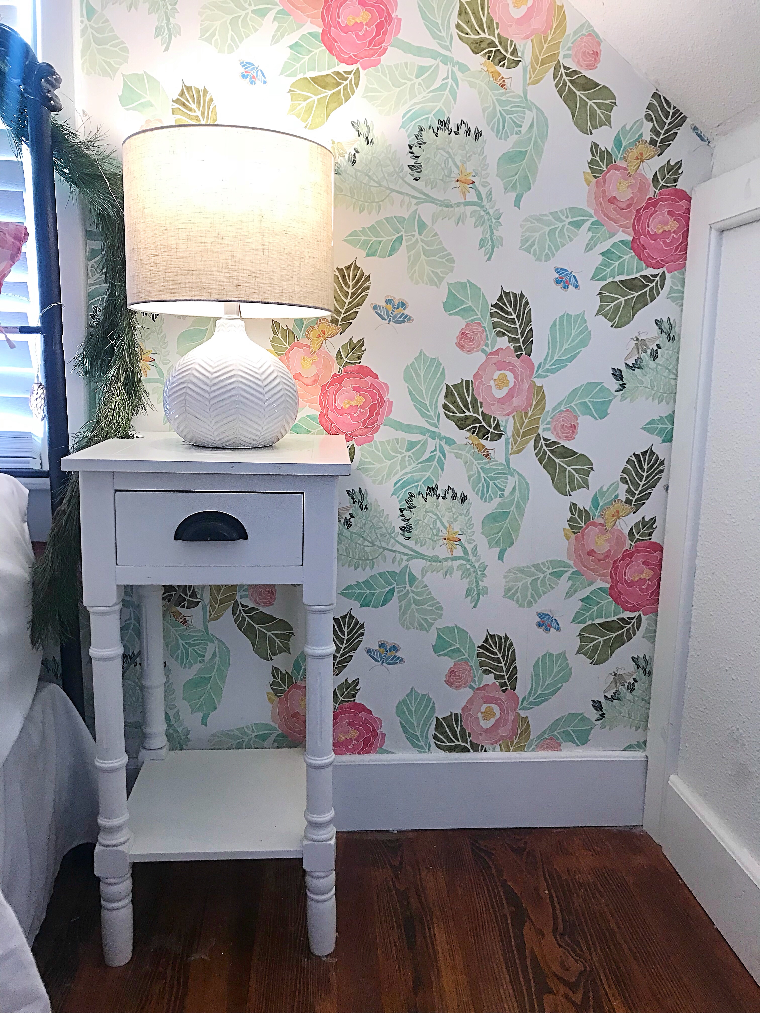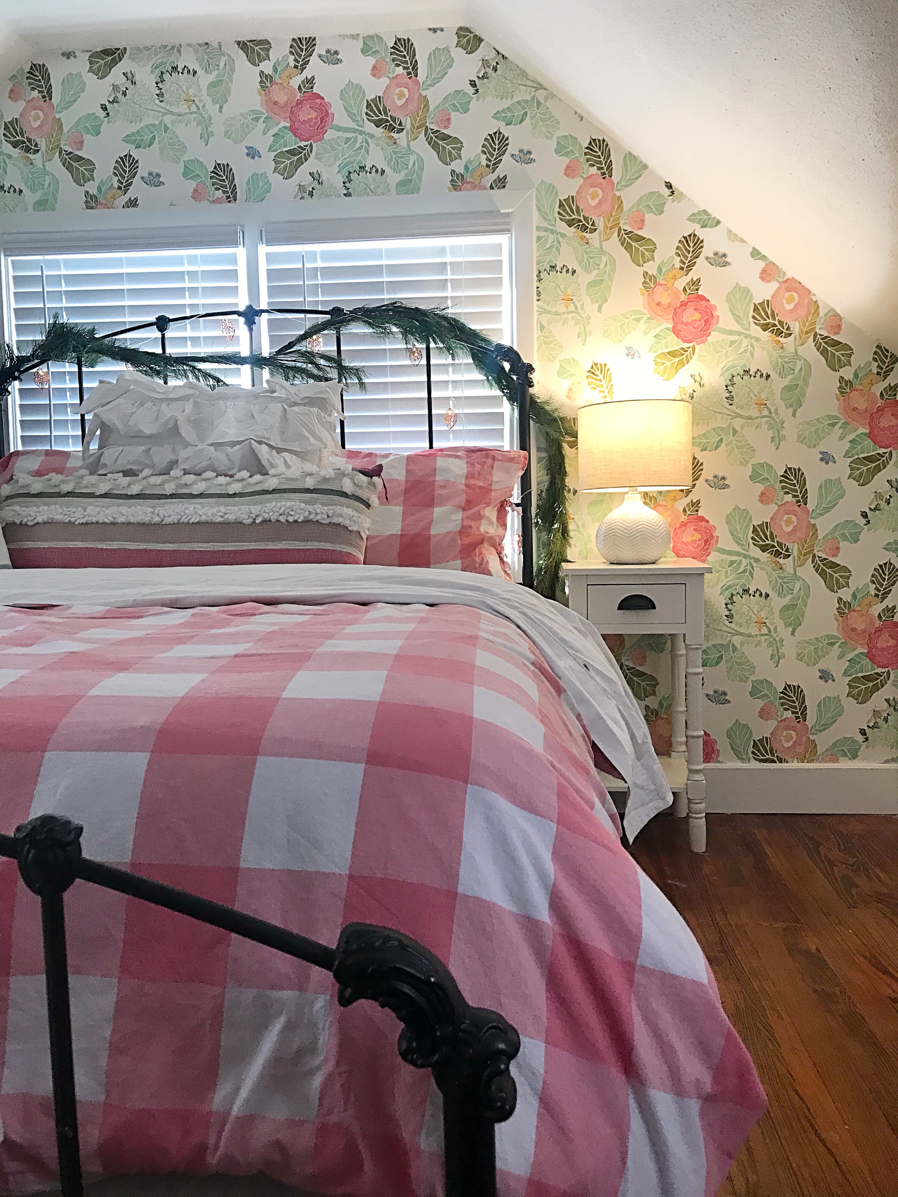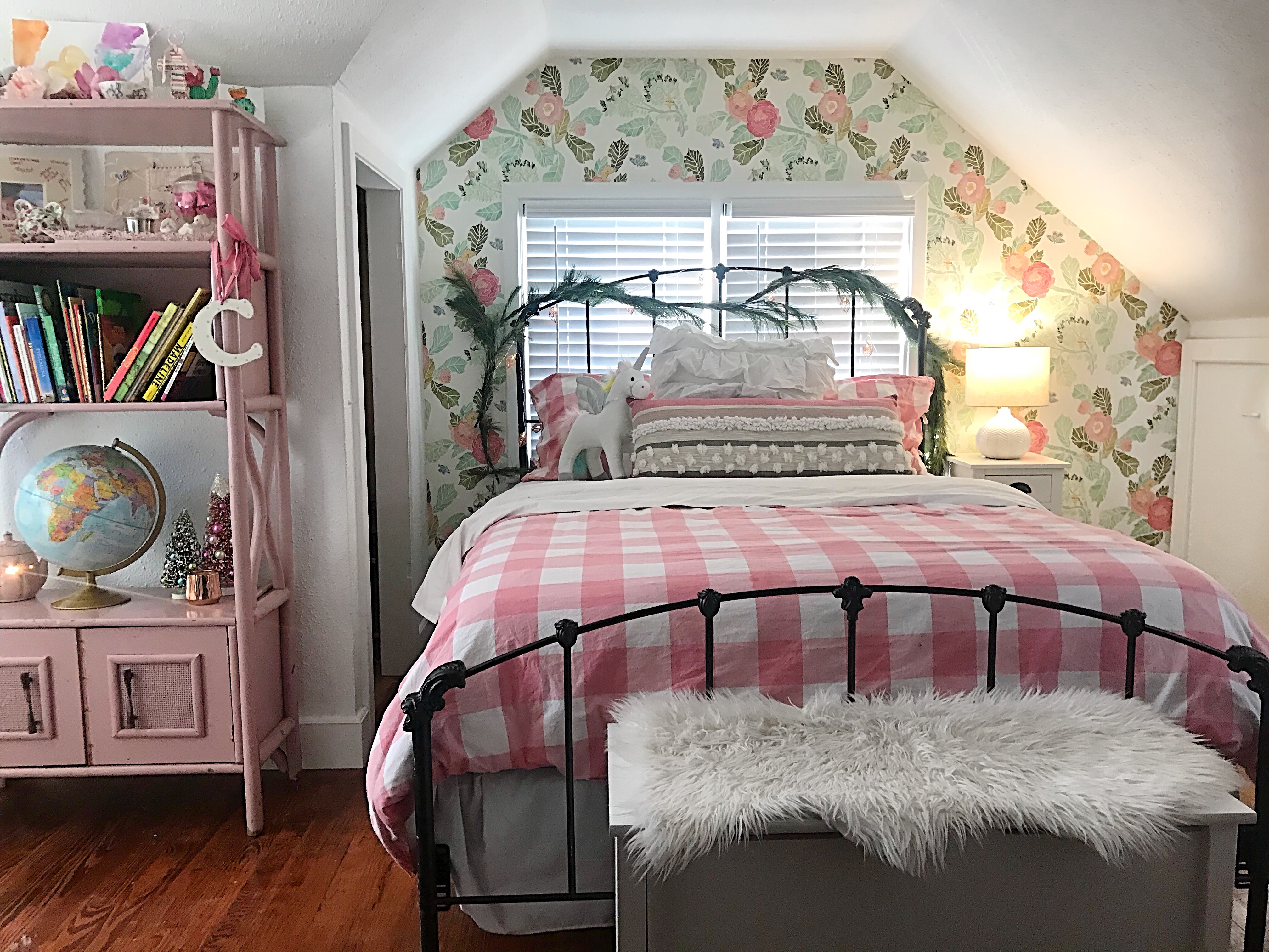 Caroline’s current room inspiration began about 3 years ago when I purchased two rolls of THIS wallpaper from Anthropologie. It literally sat in my storage closet for about 2 years, dreaming of the day I could find someone to skim-coat my very textured walls and hang the beautiful peony paper. I really wanted to accentuate the roofline and highlight the architecture these little capes have in their upstairs. It can be challenging to fit furniture in these bedrooms, but we got creative and moved it around a dozen times before deciding on this bed placement. We chose to wallpaper the two walls with windows on them and I really am so happy with the decision.