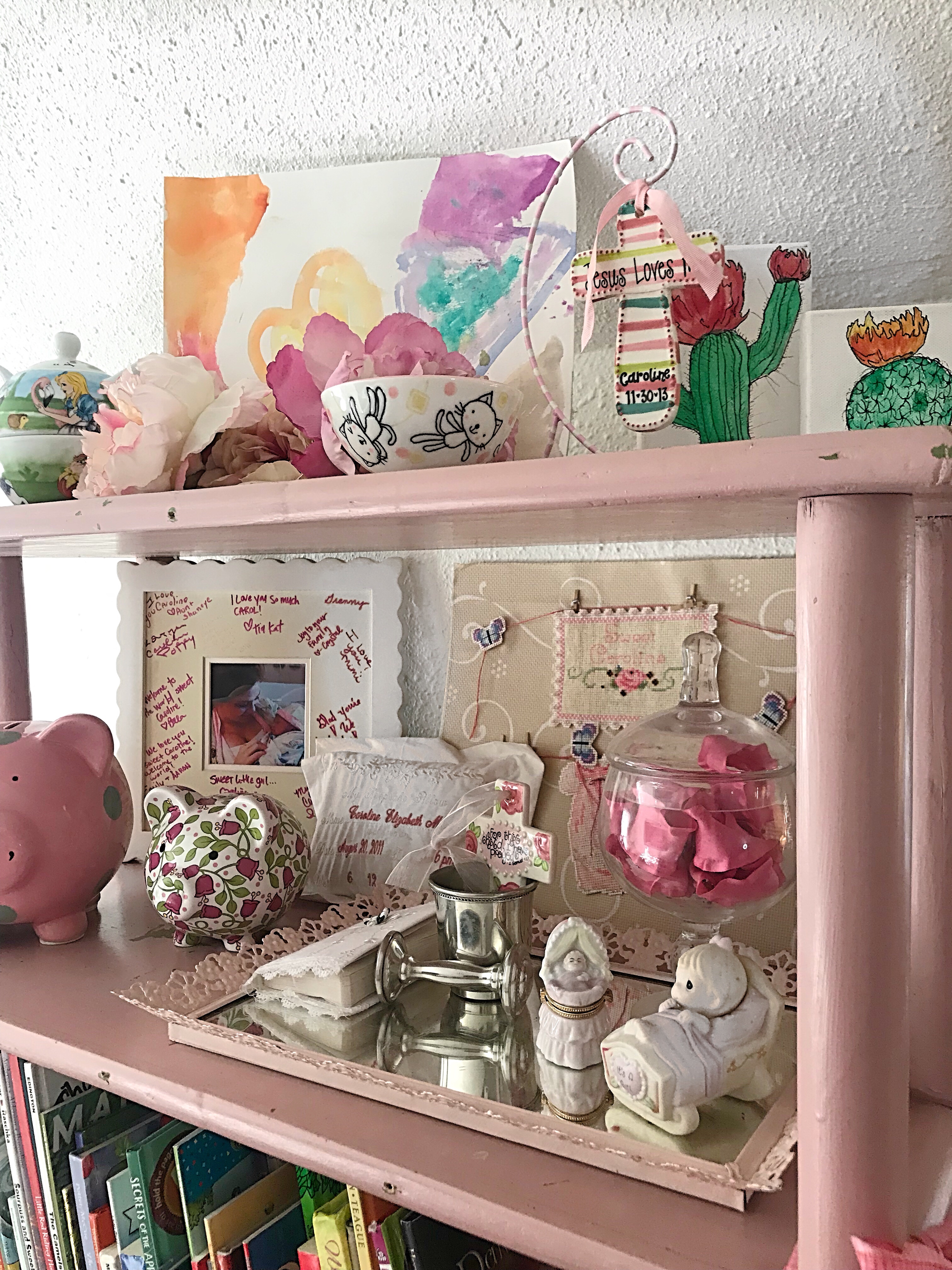 I wanted to display some of the sweet items from when Caroline was a little chubby tot. I displayed them on her pink shelf. I’ve noticed it’s the first thing that she shows her friends when they come up to her room. There is a little cross stitch that my dad’s mom made for her when she was born, a picture frame of us on her first day of life, signed by people who came to see us at the hospital, that big pink hair bow that she’s worn in every birthday picture, her pink crystal pacifier, some piggy banks from family members, her first Bible and a beautiful antique rattle my dad gifted her.
