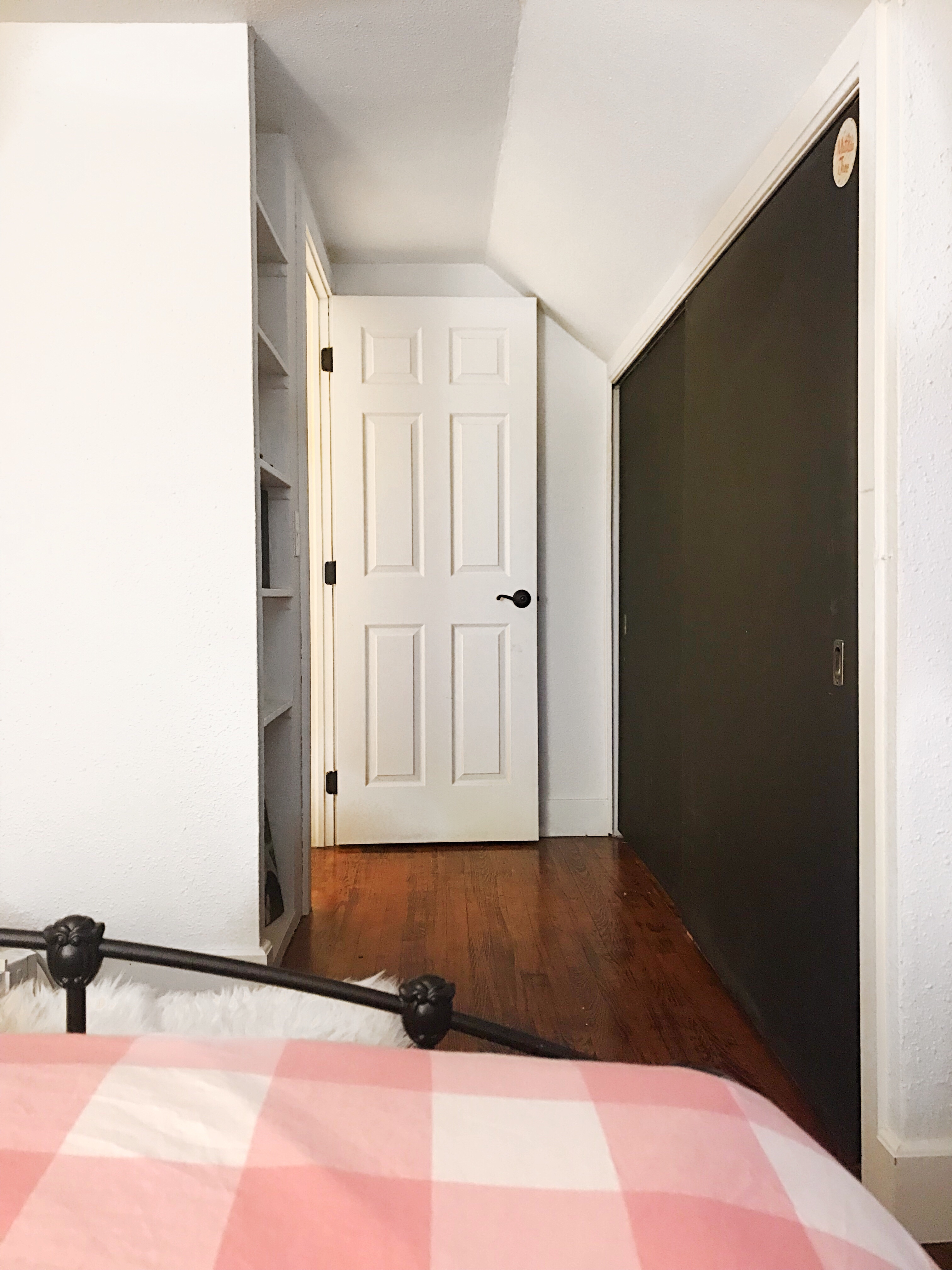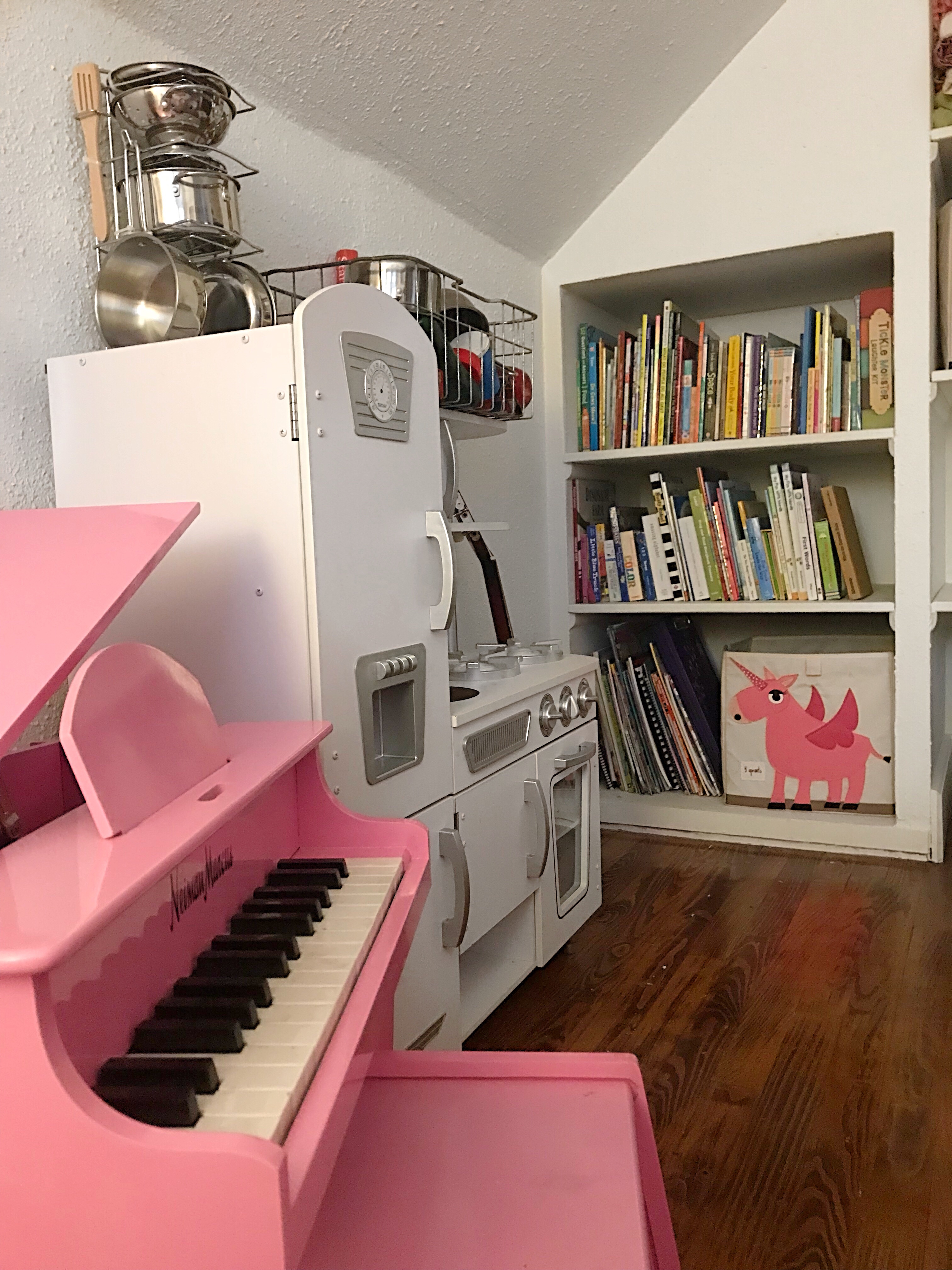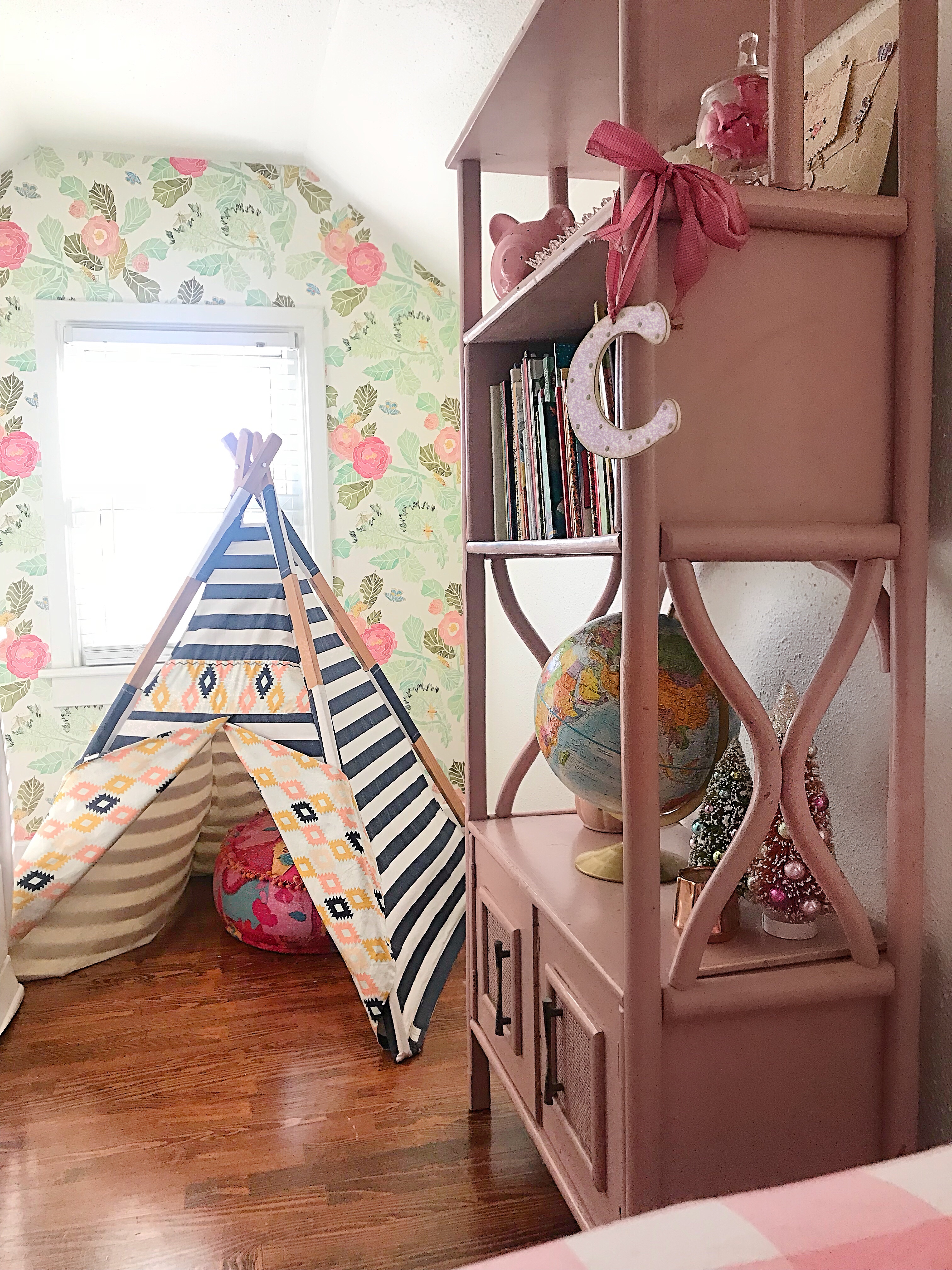 So many of the items I use in this room are second hand. This bed has been around for years, and globe on her shelf (can you believe I scored that already pink shelf at Goodwill for $5!!) we both found second hand shopping (she loved it because some countries were purple!). I think previously loved pieces add a lot of charm.