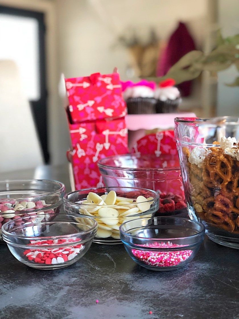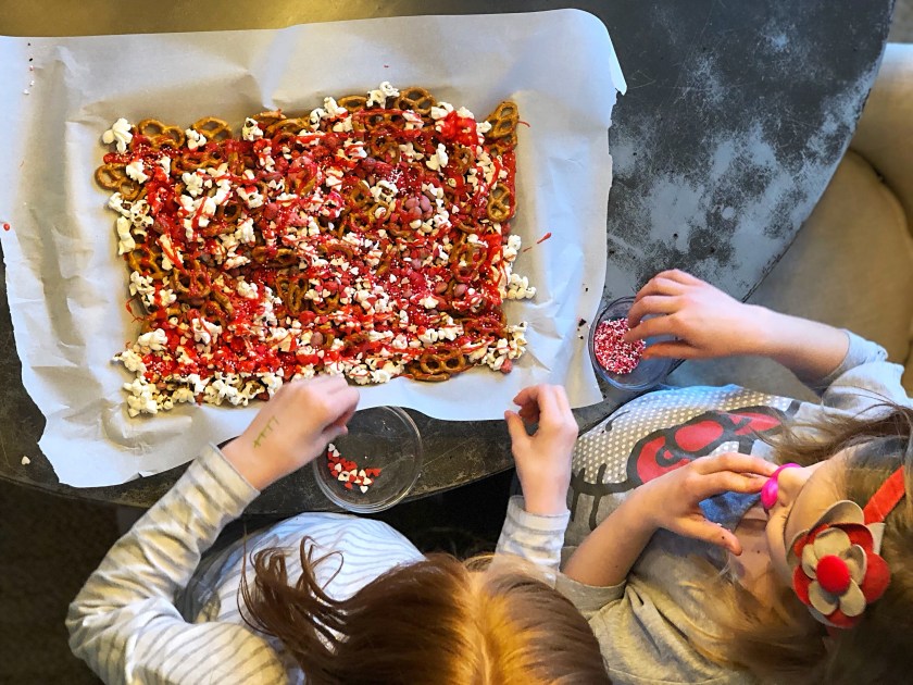 You can mix and match any red or valentines themed edible items in your snack mix. I got creative and used a Box of Cap’N Crunch and picked out all of the red cereal from the box and then I picked up these Red Jumbo Hearts Edible Confetti Sprinkles on Amazon. I also grabbed some white candy chocolate melts, these can be purchased at just about any craft or baking supply store and used food coloring to make them pink and red. You can also get the Wilton Candy Melts on Amazon as an add on item for the same price as most stores. We added some popcorn, pretzels as well as yummy yogurt covered raisins!