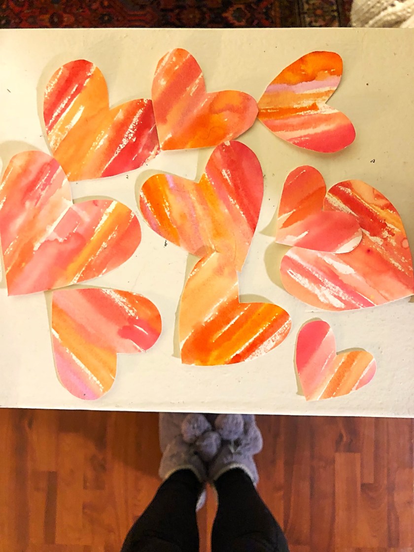 As we let the snack mix dry, we brought out the watercolor paint and let them go to town on all the pinks, oranges and reds. We then cut their masterpieces into little heart shapes to give out to people whom they love the most. We are sending a few to Texas too that hopefully make Nana and Grandpas fridge 😉